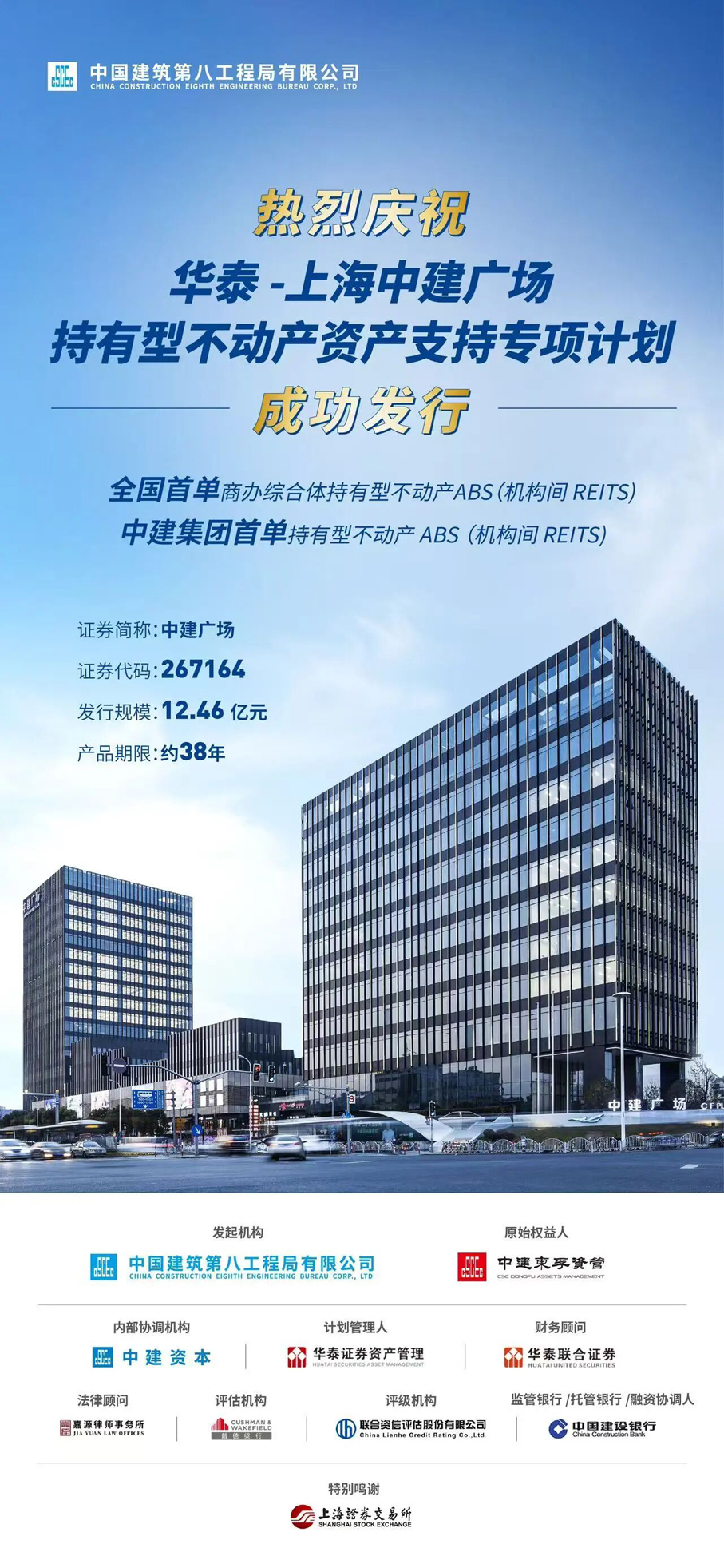 此次发行是中建集团积极贯彻中央关于“增量优化与存量资产盘活统筹”战略部署的具体实践,也是中建八局落实集团关于提升资产运营效率、推动资产证券化的重要成果,为集团后续存量资产盘活提供了创新范式与实施路径。